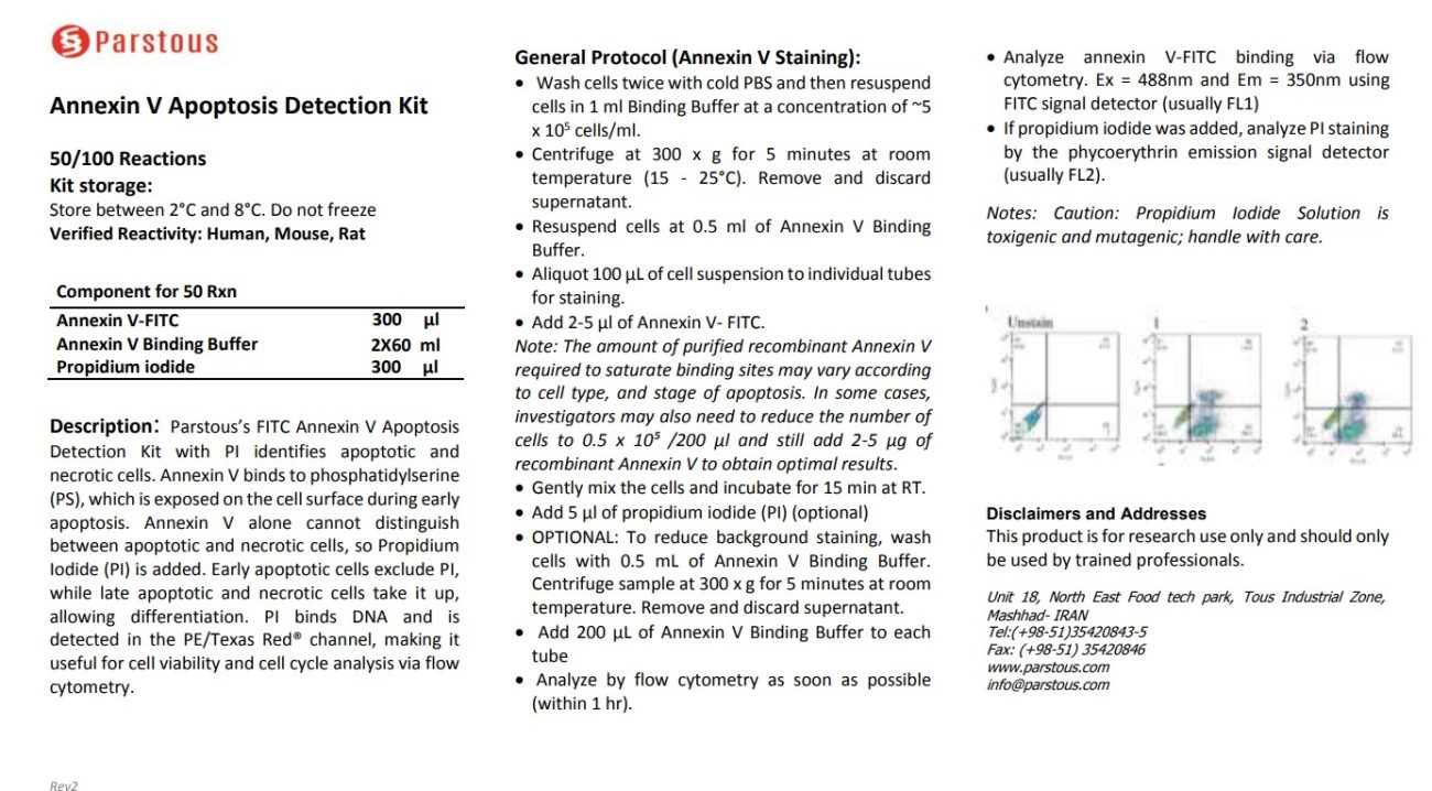 Annexin V Apoptosis Detection Kit شرکت پارس توس به دلیل کیفیت و پشتیبانی قوی، در بسیاری از مراکز تحقیقاتی و دانشگاهی کشور مورد استفاده قرار میگیرد.